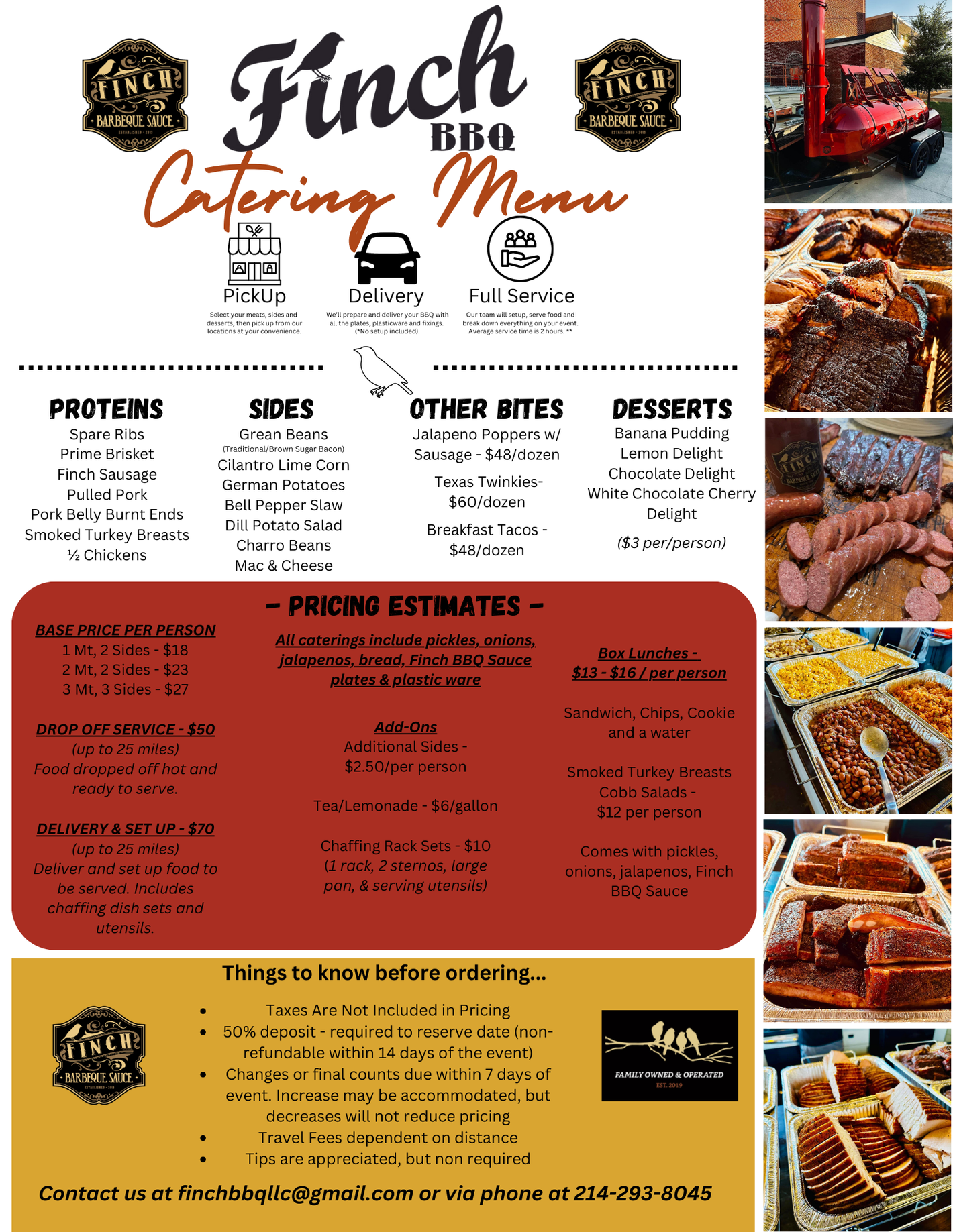 Thursday - Sunday: Drop-off/Pick-up available. We can also pull our food trailer to your location for an event, or we can bring our smoker for on-site cooking as well. Full menu available. Need at least 1 wk in advance.